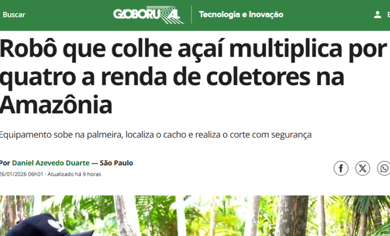 O AçaíBot, robô de colheita do açaí desenvolvido no Brasil, foi tema de uma reportagem publicada na Globo Rural. A matéria mostra como o uso